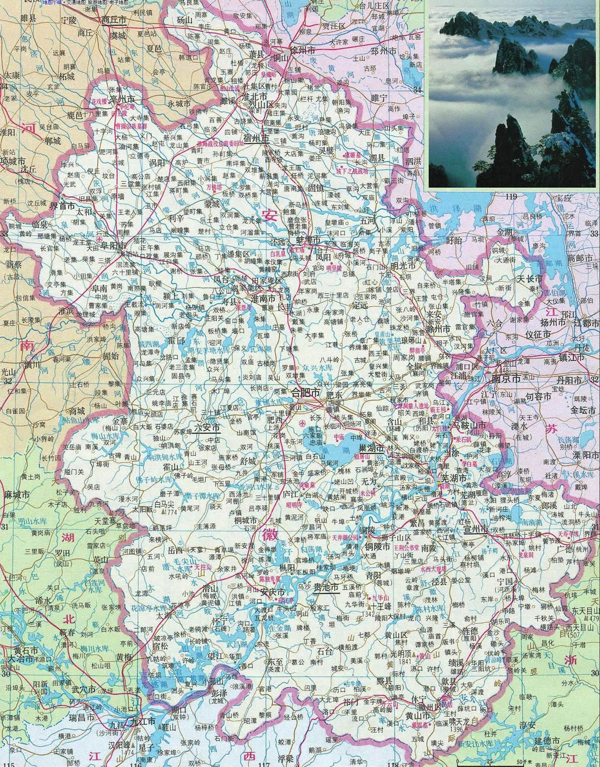 “兩根筷子夾著碗,屏障在西也在南,東面不平北邊平,黃山勝過九華山!边@首民謠形象地概括了安徽省的旅游地理面貌。兩條江河(長江和淮河)像兩根筷子,巢湖如碗,西面的大別山和東南面的天目山如屏,北邊是一馬平川的江淮大平原。而皖南的黃山、九華山則是安徽最有名的風(fēng)景名勝區(qū)。