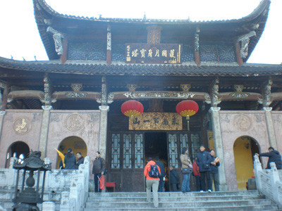 真身寶殿,俗稱“肉身殿”,又稱“肉身塔”,坐落在九華山神光嶺(老爺頂)上,為佛教徒朝謁九華圣地的主要場(chǎng)院所,這里因主供地藏菩薩,故與一般佛寺不同。九華山肉身殿是典型的宮殿建筑,殿高15米,門朝西南。入殿須登八十一級(jí)臺(tái)階,站在臺(tái)階之下,舉目仰望,可見(jiàn)南門廳上兩塊匾額:上額書(shū)“肉身寶殿”,下額書(shū)“東南第一山”。大殿四周回廊上方雕梁畫棟,仙鶴、麋鹿等珍禽異獸,牡丹、靈芝諸鮮花奇草。