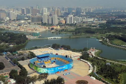 朝陽公園沙灘排球場是北京奧運會臨時場館之一,位于朝陽公園北部原煤氣用具廠舊址,由中建國際設計顧問有限責任公司設計。整個比賽用地包括一個主比賽場、兩塊熱身場和六塊訓練場,共設觀眾席位12000個,項目規(guī)劃占地面積184500平方米,建設用地面積150003平方米,總建筑面積14169平方米。包括一個住比賽場、兩塊熱身場、六塊訓練場和三座附屬功能用房,主賽場結構為管架式鋼結構。綠化面積達70%以上,是占地面積最大、綠化面積最廣的場館之一。沙灘排球場館跟“鳥巢”一樣,都屬于鋼結構建筑,用鋼量達2400噸。由于它形似“燕窩”,于是就有北有“鳥巢”、東有“燕窩”的戲說。