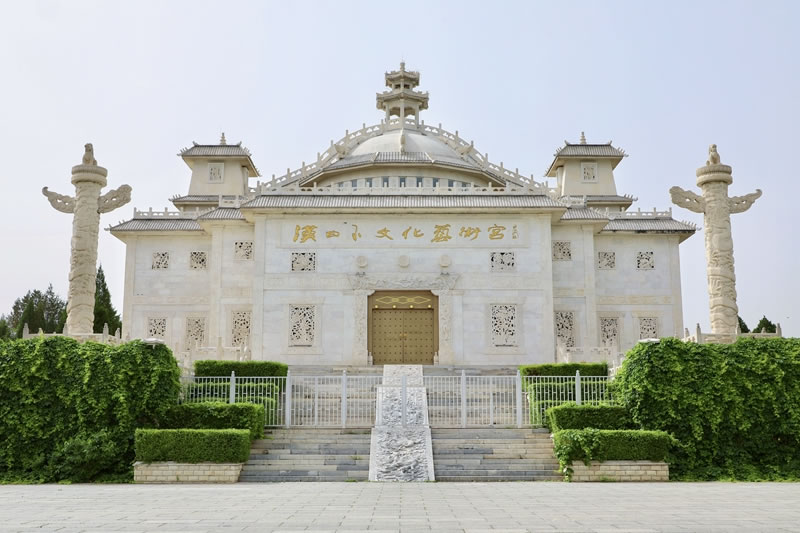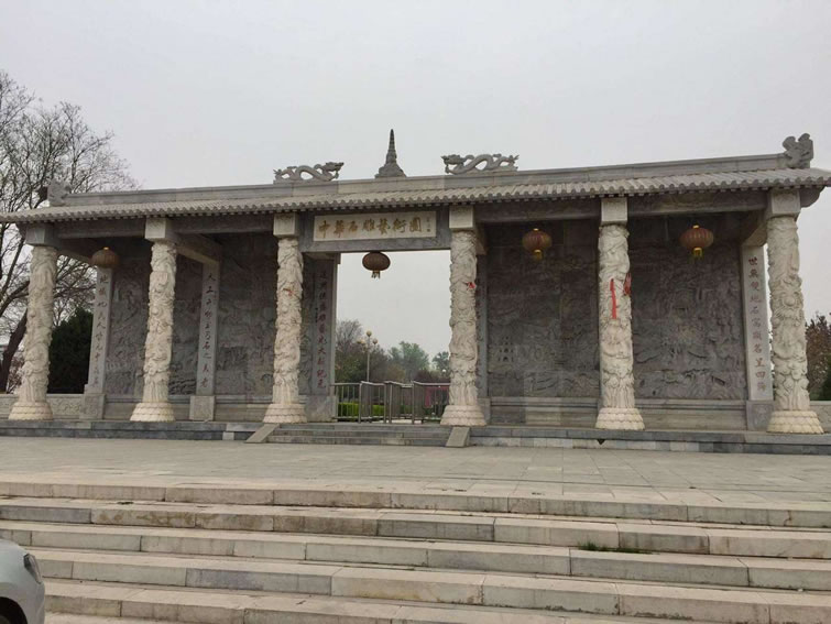 大石窩中華石雕藝術(shù)園位于北京市房山區(qū)大石窩鎮(zhèn)。園區(qū)面積2400畝,園區(qū)內(nèi)以石為主。石神、石鼎、石橋、十二生肖各種雕塑均以大理石為原材料,精雕細(xì)作而成,充分突出了石雕的藝術(shù)特色,是北京地區(qū)最大的石雕主題公園。漢白玉藝術(shù)宮位于中華石雕藝術(shù)園內(nèi),于2002年2月份動土施工,建筑面積2200平方米。工程的用料全部采用質(zhì)地精良的漢白玉石材,共使用漢白玉石料740多立方米。藝術(shù)宮高27米,最高端是一座棲賢亭,下面是一個半球型的漢白玉天棚,天棚的東、南、西、北、東南、西南、東北、西北方向各有一條漢白玉脊龍,天棚下端是由36根漢白玉側(cè)柱組成的圓柱型建筑,宮門的正上方是長方形的漢白玉牌匾題有雕塑書法大師錢紹武提寫的“漢白玉石雕藝術(shù)宮”。藝術(shù)宮四周的漢白玉角柱、立板共280塊,其中鑲有各種圖案的漢白玉浮雕,在藝術(shù)宮的東西兩側(cè)還開有高4.4米的九龍漢白玉卷拱門。每道門正下方均有一塊好似保和殿前“云龍階石”的御路。