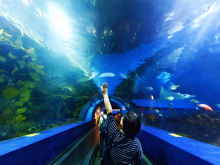 有金色的陽光、白色的沙灘、棲息在淺水海域的潮間生物。模擬生機勃勃的仿真海岸線長達48米,游客傾聽著輕柔的海浪,可以親手觸摸形態(tài)各異的海洋軟體動物;孩子們?nèi)脒M觸摸池中,能體驗海水的感覺和與大海龜嬉戲的樂趣。
