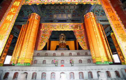 戒壇大殿:位于戒壇院內(nèi)。始建于遼咸雍五年(1069),金元明清各代均有維修,現(xiàn)仍保持著遼代的建筑風(fēng)格。大殿頂部四面呈坡形,正中間是一個正方形的小平臺。臺上安放有明成化十三年(1477)由僧人德秀捐贈的銅質(zhì)鎏金寶頂,呈金剛寶座塔形分布。中間一個高約5米,四周四個較小。殿頂?shù)纳舷麻苤g有風(fēng)廊環(huán)繞,兩層檐角均掛有風(fēng)鈴,上圓下方。大殿外側(cè)四周有20根檐柱支撐,四面正中部分均配置有稱作“戒壇枋”的外枋門。正面門額上掛有“選佛場”匾額。殿內(nèi)的橫枋上掛有清乾隆帝手書“樹精進(jìn)幢”的匾額。橫枋內(nèi)側(cè)掛有清康熙帝手書“清戒”二字的匾額。殿內(nèi)天花板金漆彩畫.正中部分為“斗八藻井”,井內(nèi)級深分為上下兩層。方形的井口內(nèi)壁上四周雕有許多小天閣,閣內(nèi)雕有小佛龕,龕內(nèi)圓形小門洞內(nèi)均有木雕漆金小佛像。藻井上層的圓形部分正中的穹頂上倒掛著一條木雕團(tuán)龍,龍頭居于藻井中心,俯視下方。團(tuán)龍四周的穹壁上還雕有八條“升龍”,合為“九龍護(hù)頂”。