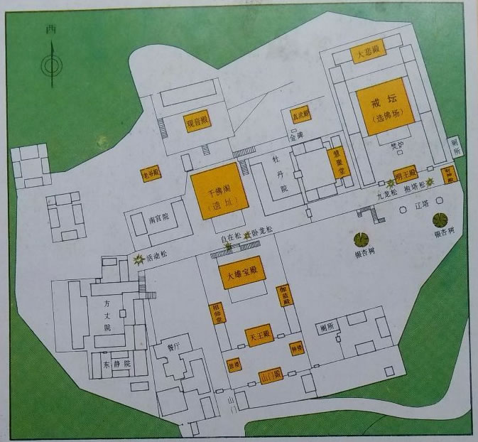 寺院坐西朝東,中軸線上依次排列山門殿、鐘鼓二樓、天王殿、大雄寶殿、千佛閣(遺址)、觀音殿和戒臺殿。其中戒臺是中心建筑。殿宇依山而筑。