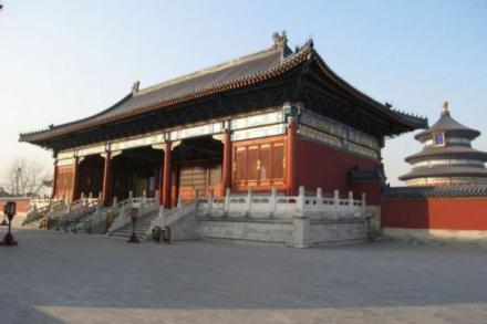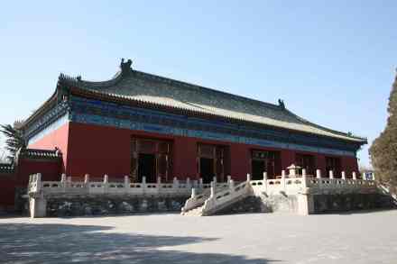 無梁殿:即齋宮正殿,建于明永樂十八年(1420年)。此殿因以磚拱承重,不用梁枋而得名;实圻M(jìn)出齋宮均在此舉行有關(guān)禮儀。現(xiàn)殿內(nèi)按乾隆時(shí)期原貌陳列,橫額“欽若昊天”為乾隆御筆,屏風(fēng)、寶座均為原物。