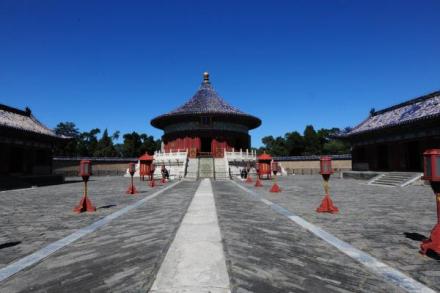 圜丘壇區(qū)域占地面積44.66公頃,是舉行祭天大典的場所,又稱祭臺、祭天臺、拜天臺。圜丘壇外圍墻兩重,內(nèi)圓外方,紅墻藍(lán)瓦,四面各辟根欞星門。圜丘壇北為皇穹宇。皇穹宇由正圓形的圍墻所包圍,墻面平整光滑聲波可由墻壁傳遞,俗稱“回音壁”。齋宮區(qū)域占地面積4公頃,內(nèi)有鐘鼓樓、無梁殿、寢殿等,建筑均覆以綠色琉璃瓦,以示“上天之子”所居。