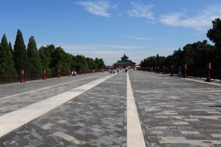 丹陛橋長360米,是連通圜丘壇和祈谷壇的一條高出地面4米的大道。大道中部下有東西向券洞通道,故名橋,是北京最古老的“立交橋”。橋面寬30米,中間石板大路為“神路”,供天帝專用;東側(cè)磚砌路面稱“御路”供皇帝專用,陪祀王公大臣只能在西側(cè)的“王路”上行走,上下進(jìn)退等級分明。丹陛橋北高南低,北行令人步步登高,如臨天庭。