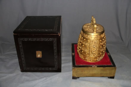 鍍金銀質(zhì)。體圓,直口平唇,短頸,鼓腹,兩側(cè)飾天官耳,腹下三足。爐口雷紋,通體刻八卦云鶴紋。爐蓋圓形,疊二層,上層鏤空乾、兌、震紋,后有香靠具缺刻。香靠具一付,從爐體內(nèi)壁靠具槽處插入爐內(nèi)。香靠具七出,鶴紋如意云頭,中間香插有圓框,以插圓形柱香。爐底陰刻楷書款“恒利銀號造京平足紋,重一百九十一兩五錢,鍍金十五兩三錢”“光緒癸卯年制”。