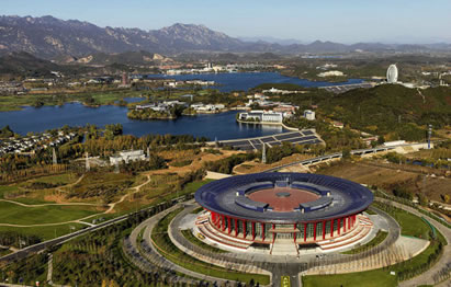 北京雁棲湖國(guó)際會(huì)展中心位于雁棲湖西南側(cè),坐落于范崎路上,建筑主體是圓形大樓,建筑造型外觀似天壇無(wú)蓋,寓意天圓地方,設(shè)計(jì)風(fēng)格與雁棲島上的雁棲湖國(guó)際會(huì)議中心相輔相成。主要功能是供各大公司 產(chǎn)品發(fā)布、展覽等等,2015年第五屆北京國(guó)際電影節(jié)開(kāi)閉幕式舉辦地。