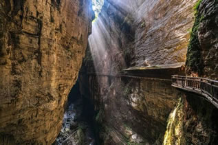 青天峽地縫全長1500米,最窄處不到2米,兩岸懸崖峭壁,高度300~700米,抬頭僅見天光一線。地縫中怪石林立,鐘乳石千姿百態(tài),兩壁峭崖有的地方僅隔數(shù)尺。當(dāng)雨過天晴或正午陽光朗照,陽光穿透地縫,與崖壁上的流水發(fā)生折射后會(huì)形成“一米陽光”奇觀。