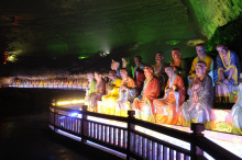 煙云洞位于三泉鎮(zhèn)觀霞山,海拔1040米。每至冬春,有白色霧氣從洞口飄散而出,故名“煙云洞”,形成于中生代三疊紀,距今約1.8億年。洞內(nèi)鐘乳石密集,洞呈環(huán)形,長800余米,進、出洞口各一,下進上出。進口為人工開鑿的拱形隧道,高2米,寬1.8米,長27米。洞內(nèi)可分為金佛殿、水晶宮、千塔林、降龍洞、洗象池、九柱門廊、禹王執(zhí)圭、仙人田、金獅送客9個景段。出口為原生洞口,沿金佛殿洞壁斜上而出。