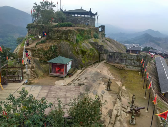 滑石寨位于金帶鎮(zhèn)滑石村3組,是平壩上突兀拔起的一座高260多米的孤峰。孤峰呈紡錘形,四周皆是懸崖峭壁,峰頂平地有6000平方米左右。峰西是一堵傾斜約75度、近10萬(wàn)平方米的完整石壁,石壁上鑿有一條寬不盈尺的之字形石階,它是通達(dá)寨上的惟一路徑。從山下到寨上要走1個(gè)多小時(shí)路程,其中要經(jīng)過2000多級(jí)在石壁上開鑿的石階,山腰到山頂分別有兩道寨門把守。記者在現(xiàn)場(chǎng)看到,山腰一道寨門門楣上清晰刻寫著“未雨,嘉慶二年十月立”字樣。登上寨頂,數(shù)十間木質(zhì)結(jié)構(gòu)的房瓦痕跡依稀可見,青石砌的寨門和寨堡仍保存完好,四道墻體上都開有射擊孔。整個(gè)寨堡耗石約1萬(wàn)多方,工程浩大,令人稱奇。
