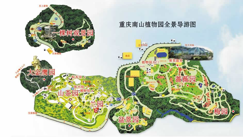 重慶市南山植物園位于重慶市南岸區(qū)南山植物園路101號,與重慶市中心隔江相望,距市中心15公里。其海拔420m-680.5米,東西寬5000米,南北長3500米,規(guī)劃控制面積15平方公里,實(shí)際占地551公頃。