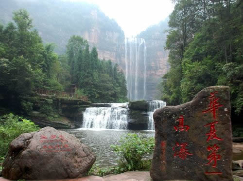 一雄一雌,一南一西,對(duì)巖相望,故名鴛鴦瀑布。南瀑高110.82米,為雄瀑,瀑水時(shí)而懸垂跌落,時(shí)而貼臂滑流;西瀑高90.25米,是雌瀑,瀑水絲絲縷縷,猶如戀人的情絲。雙瀑相望,一路飛珠涌向?qū)Ψ剑詈笤诠鹊兹跒橐惑w,向北而去。