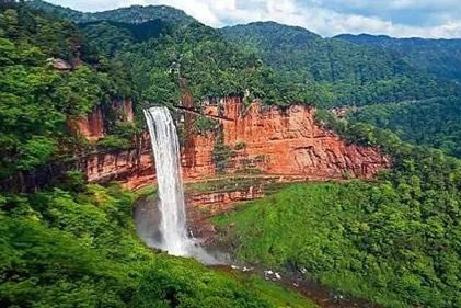 土地巖瀑布在土地巖壁畫(huà)對(duì)面,如一潔凈的白緞懸垂而下。瀑布高89米,寬25米,懸垂于綠樹(shù)紅巖之中,三面赤壁環(huán)繞,與巨幅丹霞赤壁兩相呼應(yīng),形成四山鎖絕谷、一水落幽林、綠樹(shù)映湖色、丹霞醉畫(huà)屏的絕景。