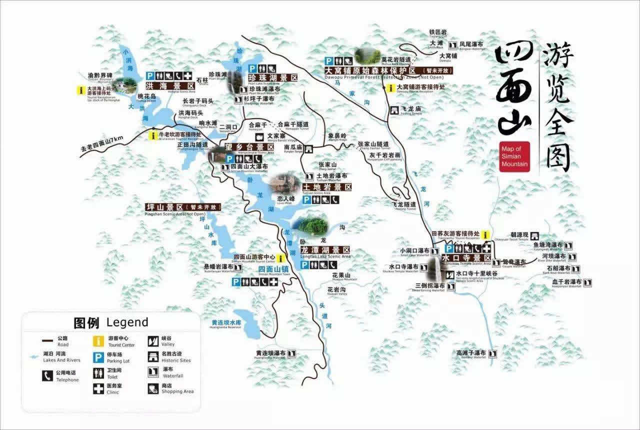 洪海為1970年洪海村人興修的水庫(kù)。分為大洪海、小洪海兩個(gè)湖泊,大洪海海拔1200米,全長(zhǎng)6850米,寬60~200米不等,最深處12米,總蓄水量310萬(wàn)立方米,中部有一桃花島。洪海兩岸樹(shù)木蔥蘢,或直或斜,直者勢(shì)比天高,斜者旁逸水中。每到春季,洪海兩岸各色高山杜鵑競(jìng)相盛開(kāi),舟行洪海,兩岸青山疊翠,常有麋鹿、山羊在湖邊飲水,湖面碧波粼粼,鴛鴦戲水隨處可見(jiàn),不時(shí)有白鷺飄然飛起。