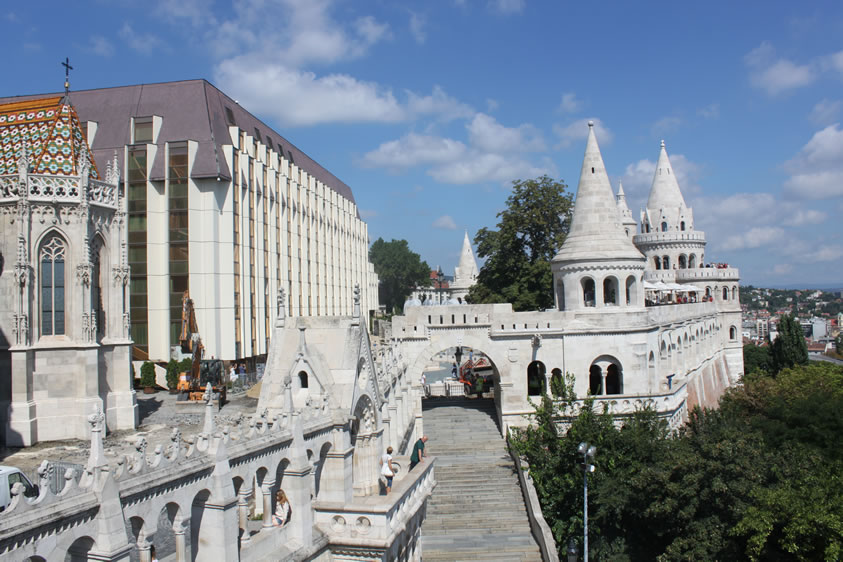 漁人堡 漁人堡(Halászbástya)是一個(gè)新哥特式和新羅曼風(fēng)格的觀景臺(tái),位于匈牙利首都布達(dá)佩斯布達(dá)一側(cè)多瑙河河畔的城堡山,鄰近馬加什教堂。它修建于1895年到1902年之間,設(shè)計(jì)師是弗里杰·舒勒克(Frigyes Schulek)。第二次世界大戰(zhàn)期間,漁人堡近乎毀滅。1947年至1948年之間,弗里杰·舒勒克的兒子亞諾什·舒勒克負(fù)責(zé)了修復(fù)工程。 如今,城堡的一部分作為餐廳使用;乩壤镉薪^佳的觀景角度,而瑪加什教堂與漁人城堡間的銅像,則是第一位匈牙利國(guó)圣·伊斯特萬(wàn)一世,圣·史迪分國(guó)王雕像(King St. Stephen’s statue)圣·史迪分國(guó)王是匈牙利第一個(gè)天主教國(guó)王(公元1000年加冕),同時(shí)也可以說(shuō)是匈牙利國(guó)的建立者。漁人堡旁的希爾頓旅館,外層是茶色的帷幕玻璃映照著漁人堡和一旁的教堂倒影,美麗而迷人。 從塔和觀景臺(tái),可以看到多瑙河、瑪格麗特島、東面的佩斯,以及蓋勒特丘陵(Gellért Hill)的全景。