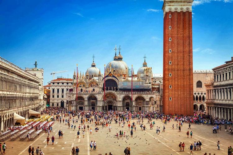 圣馬可廣場 圣馬可廣場(Piazza San Marco) ,官方標準譯名圣馬爾谷廣場,又稱威尼斯中心廣場,一直是威尼斯的政治、宗教和傳統(tǒng)節(jié)日的公共活動中心。圣馬可廣場是由公爵府、圣馬可大教堂、圣馬可鐘樓、新、舊行政官邸大樓、連接兩大樓的拿破侖翼大樓、圣馬可大教堂的四角形鐘樓和圣馬可圖書館等建筑和威尼斯大運河所圍成的長方形廣場,長約170米,東邊寬約80米,西側(cè)寬約55米。廣場四周的建筑從中世紀到文藝復(fù)興時代都有。 圣馬可廣場初建于9世紀,當時只是圣馬可大教堂前的一座小廣場。馬可是圣經(jīng)中《馬可福音》的作者,威尼斯人將他奉為守護神。相傳828年兩個威尼斯商人從埃及亞歷山大將耶穌圣徒馬可的遺骨偷運到威尼斯,并在同一年為圣馬可興建教堂,教堂內(nèi)有圣馬可的陵墓,大教堂以圣馬可的名字命名,大教堂前的廣場也因此得名“圣馬可廣場”。
