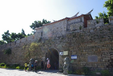 城內(nèi)有四個城門,南北門相距約500多米,東西門相距約300多米。東、西、北三座城門相似,各有兩道城門,外加筑月城,上建城樓,城門上各設(shè)烽火臺一座,南城門則外加設(shè)一照墻,照墻前有一尊關(guān)公雕像。相傳當(dāng)年倭寇炮轟城池,城內(nèi)關(guān)帝廟的關(guān)云長把青龍偃月刀一揮,炮彈被撥落在城墻旁,再一揮,炮彈射回賊船,于是船沉寇亡。西門的兩道城門如今依舊完好地保留下來。蔭涼的城門下擺有幾個小攤子。城內(nèi)的十字大街聯(lián)結(jié)著四個城門,街道則由一塊塊石板鋪就而成。