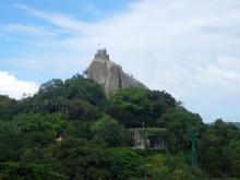 俗稱“巖仔山”,別名“晃巖”,相傳鄭成功來到晃巖,看到這里的景色勝過日本的日光山,便把“晃”字拆開,稱之為“日光巖”。日光巖游覽區(qū)由日光巖和琴園兩個部分組成。日光巖聳峙于鼓浪嶼中部偏南,是由兩塊巨石一豎一橫相倚而立,成為龍頭山的頂峰,海拔92.7米,為鼓浪嶼最高峰。日光巖寺,俗稱“一片瓦”,實(shí)際是一個天然石洞,以一巨石為頂,后依山形地勢建起寺廟的,具體時間是明朝正德年間萬歷十四年。日光巖寺屢毀屢建,清同治年間,建圓明殿,祀彌勒,并在廟前建一八角亭,上掛“日光寺”匾。解放后,圓明殿改為念佛堂,大雄寶殿是民國十六年(1917年)年建的。
