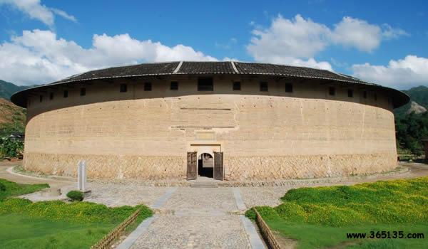 二宜樓:這座被譽(yù)為"國之瑰寶"的圓土樓,座落在華安縣仙都鎮(zhèn)大地村。仙都、大地,這是多么富有詩意的名字,其實(shí)二宜樓就是人間天堂的一座民居,就是中華大地的一顆璀璨明珠。 二宜樓依山傍水,樓后峰巒疊嶂,近處山丘綿延,猶如蜈蚣緩緩爬行(風(fēng)水先生稱之為"蜈蚣吐珠地");兩條清澈的小溪在樓前交匯后,直奔西南而去。青山綠水,與黃墻黑瓦交相輝映,小橋、樓閣、翠竹、村舍點(diǎn)綴其間,渾然一體,正是"宜山宜水"的一派旖旎風(fēng)光。樓內(nèi)祖廳便有一對柱楹,專門概述這一景觀:"倚杯石而為屏,四峰拱峙集邃閣;對龜山以作案,二水瀠洄萃高樓。" 所謂宜山宜水,其實(shí)還隱寓樓主蔣仕熊排行第二,又是第二次擇地,才選中這蜈蚣吐珠穴位,其得意之情溢于言表。在族人的傳說里,蔣仕熊年輕時(shí)是個(gè)種田能手,他身材高大,體格健壯,臂力超人,能使一把廿四斤重的大刀,可惜他人才超群,卻遲遲未能成家,說是犯了"孤鸞命",注定一輩子打光棍。族人背地里取笑他說:"無某(妻)無猴,鎖匙掛褲頭。"他一氣之下出走他鄉(xiāng),到安溪、漳平等地開墾荒田幾百畝。不久,他遇到了一個(gè)魏氏姑娘,兩人婚配后,生了六個(gè)兒子。蔣仕熊晚年衣錦返鄉(xiāng),開始投巨資建樓,由于操勞過度,他在二宜樓尚未建成時(shí)便不幸逝世,他的六個(gè)兒子、十七個(gè)孫子繼承遺志,艱苦努力,終于在清乾隆35年(1770年)把大樓建成。