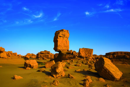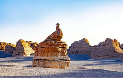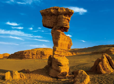 柱狀雅丹,是形態(tài)最為獨(dú)特的柱狀雅丹體。上部的粘土層難風(fēng)化,而下部的沙質(zhì)層卻易于風(fēng)化。這種差異形成了頂部粗大的塊體高懸于下部細(xì)小的柱體之上,在形態(tài)上似天外來客眺望凝思,吸引著游人去探索它的奧秘。