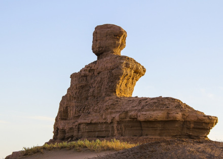 墻狀雅丹,屬于墻狀雅丹體向塔狀雅丹體的過渡類型。雅丹體由沙質(zhì)和泥質(zhì)沉積物組成,差異侵蝕風(fēng)化作用形成了凹凸不平的表面。遠(yuǎn)遠(yuǎn)望去,酷似埃及的“獅身人面像”,充分展示了大自然的巧奪天工。