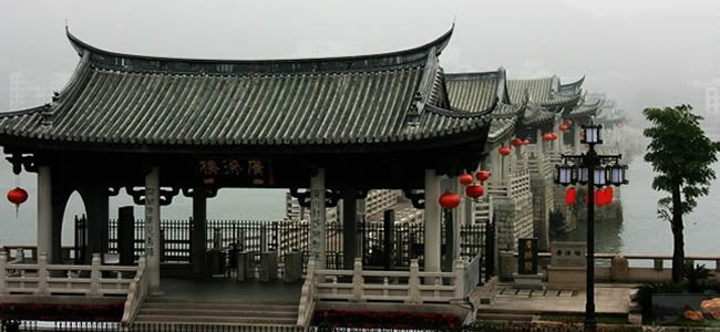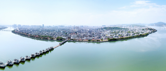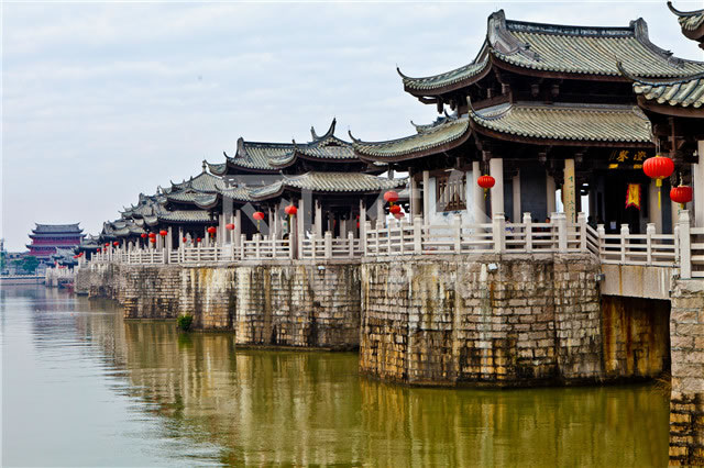 廣濟(jì)橋始建于南宋乾道七年(1171年);明朝嘉靖九年(公元1530年)形成“十八梭船廿四洲”的格局;解放前殘破不堪;1958年進(jìn)行加固維修,并拆除了十八梭船,改建為三孔鋼架及兩處高樁承臺式橋梁;2003年10月開始進(jìn)行全面維修,總體按明代風(fēng)格為修復(fù)依據(jù),功能定位為旅游觀光步行橋;2007年竣工。