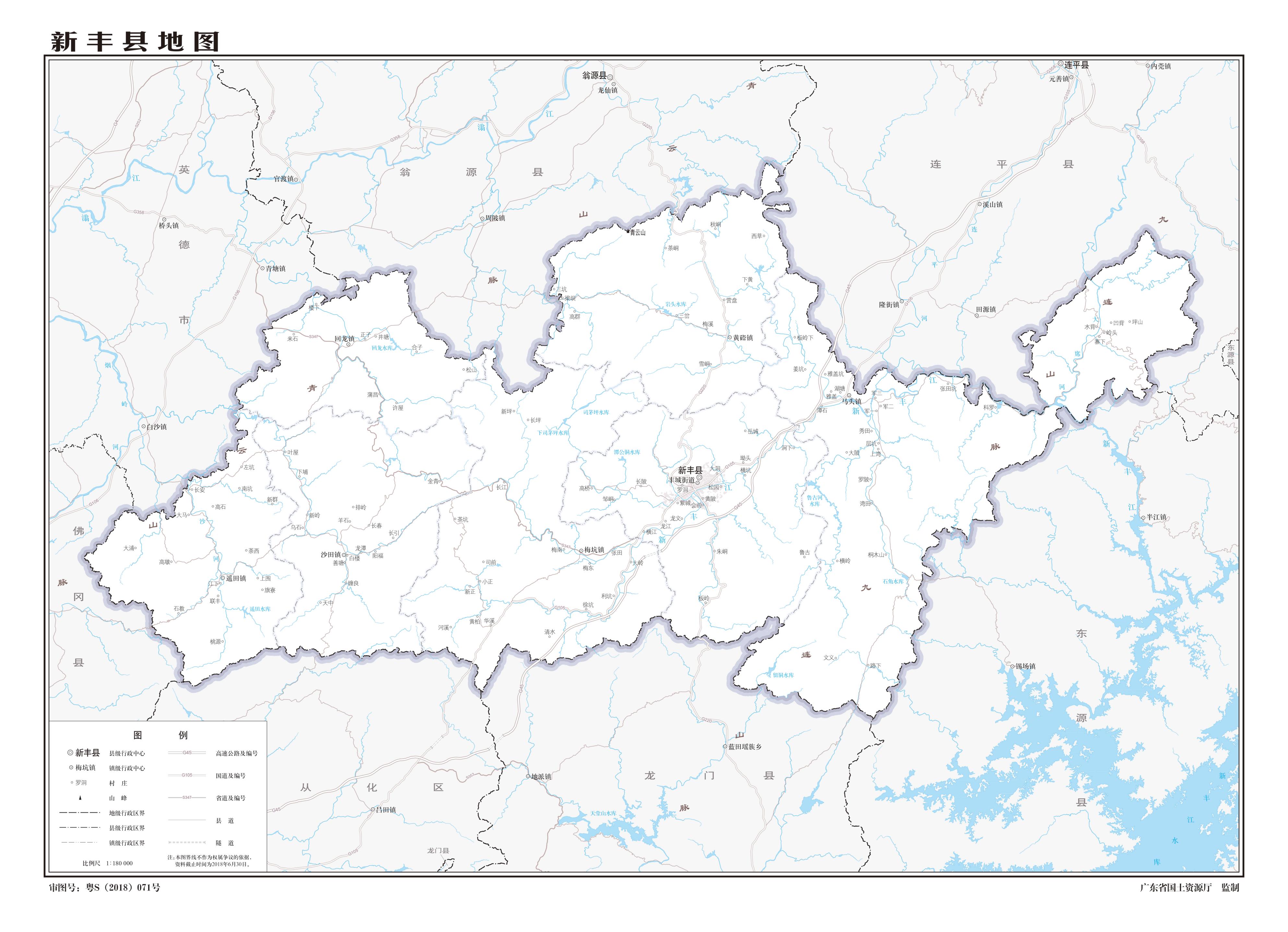 位置境域 新豐縣地處粵中偏北,韶關(guān)市南端,東江、北江和流溪河三河水系分流之處,新豐江上游。南連從化、龍門,北接翁源,東鄰連平,西靠佛岡;縣境范圍東西界于東經(jīng)113°42′至114°36′,東西相距98.4公里,南北界于北緯23°53′至24°17′,南北相距45公里,全縣總面積2015平方公里。距廣州150公里、深圳180公里、韶關(guān)160公里。