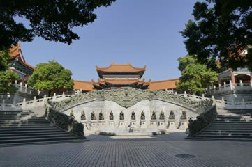 三清殿東南邊這座三層綠色琉璃蓋頂的半仿古大樓,稱太和樓,二樓大廳是中華民族館,反映中國56個民族的居住地,民俗和穿戴的服飾。三樓大廳是雅石館,館內集天下之奇石。所謂奇石,就是自然生成形狀奇怪的石頭,例如其中一塊菊花石,就是花都區(qū)花山鎮(zhèn)的特產。這石頭無論敲成多少塊,滿身都是菊花形狀,白色半透明;ǘ紖^(qū)區(qū)花是菊花,是源于特產菊花石寓意。山門、山門牌坊門、廣場(兩側為鐘樓、鼓樓,各立一華表)、三清大殿(采用傳統(tǒng)的天壇形式建造,殿頂的巨大圓球以純金制成)為觀的中軸建筑。該觀整體建筑以仿古“天壇”形式建造,氣派莊嚴,四周環(huán)境雅致,素有廣東“小天壇”之稱。 |