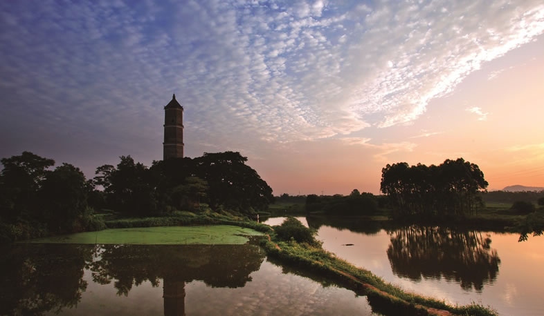 蓉峰塔位于縣城北,始建于清朝道光初年(1821年),塔高40余米,共五層,為八棱青磚結(jié)構(gòu)。遠眺寶塔猶如文筆豎立,每當(dāng)夕陽西下,塔尖猶如筆尖,塔影延及湖中,形同秀筆蘸墨。