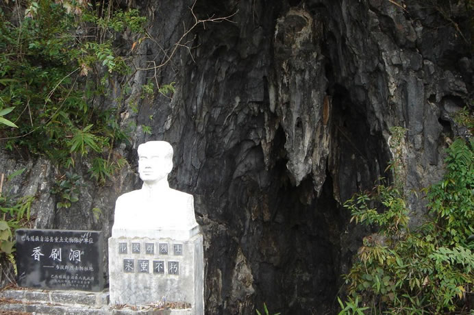 香刷洞位于西山鄉(xiāng)弄列村東北部的一座半山坡上,香刷洞為石灰?guī)r溶洞,洞口高5米,深10米,寬約6米,洞底型似臥底,洞中一年四季比較干燥,洞內(nèi)可容納20多人。洞內(nèi)右側(cè)一高處有一平臺(tái),可以臥人,臺(tái)左側(cè)有一小洞穴可以匍伏出洞外。民國21年間(1932年)10月19日晚,堅(jiān)持在右江斗爭的中國工農(nóng)紅軍獨(dú)立第三師師長韋拔群在戰(zhàn)略轉(zhuǎn)移中隱藏在此洞中,不幸被叛徒韋昂殺害,犧牲時(shí)僅38歲。香刷洞是巴馬瑤族自治縣縣級(jí)重點(diǎn)文物保護(hù)單位。