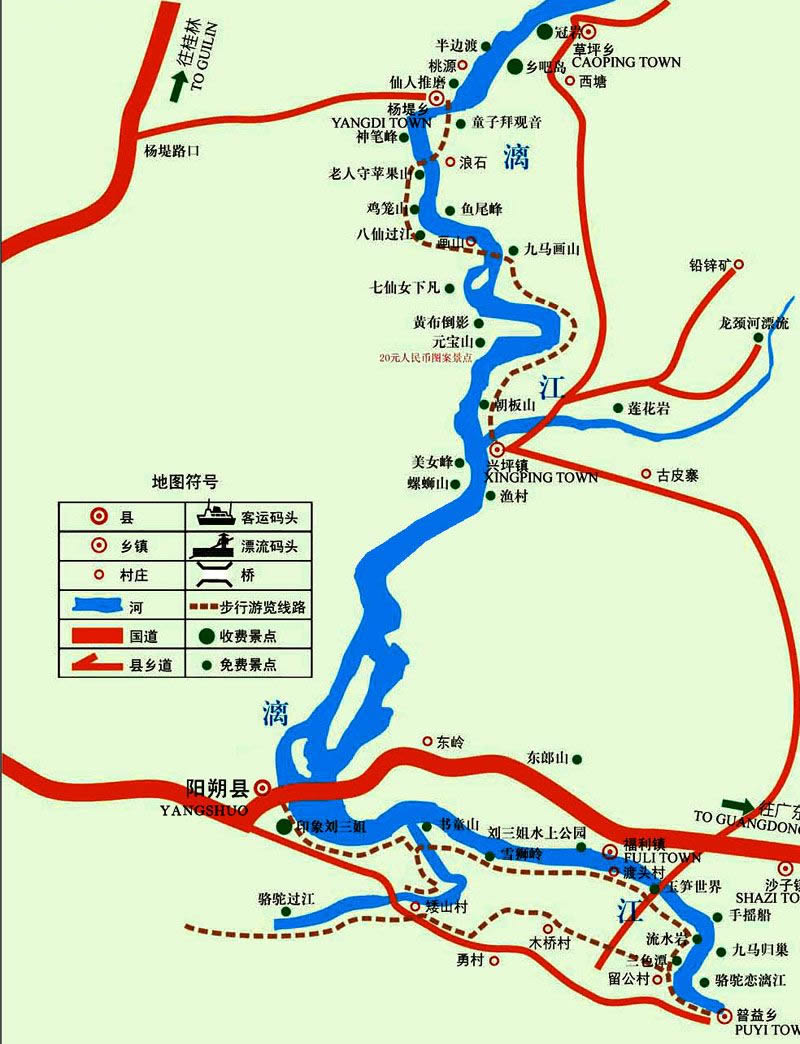 興坪鎮(zhèn)位于廣西壯族自治區(qū)桂林市陽朔縣縣城東北部,漓江上游兩岸,距縣城25公里。漓江流經(jīng)興坪,形成“S”字形河灣,是漓江風(fēng)光的薈萃之地。葉劍英元帥《由桂林舟游陽朔》詩道:“春風(fēng)漓水客舟輕,夾岸奇峰列送迎。馬躍華山人睇鏡,果然佳勝在光坪”。山水相依,景點密集,兼有奇、險、秀、美、趣的特點。