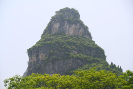螺獅山,在漓江西岸,石山紋理自下螺旋而上,直至山頂,整座山酷似一個大青螺。郭沫若詩中有“青螺負(fù)雨壓長河”之句,在山下有螺螄巖,河口開闊明亮,明代建騰蛟庵,由三寶殿、魁星樓組成,清代重修。洞前香爐石,形狀酷肖。洞內(nèi)有三顆螺螄石,一白如雪,一綠如玉,一黑如漆,巖內(nèi)有摩崖碑文,記載巖的由來和附近景色。