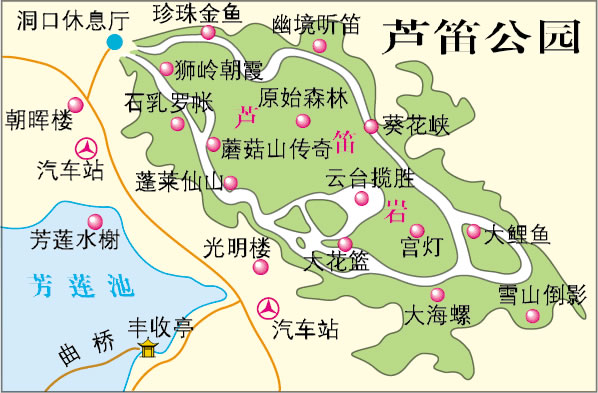 景區(qū)內(nèi)交通:一條路是沿著山南的芳蓮池畔往西走,可到洞口下方,再登上石級進(jìn)洞。另一條路是從光明山東南麓緩緩向上走,穿過綠蔭小道,便到蘆笛巖洞口。