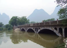 進(jìn)入蘆笛景區(qū)首先見到的就是一座端莊古樸的石橋—飛鸞橋。飛鸞橋又名飛龍橋,位于桃花江與蘆笛路相交處。臨桂縣志載,宋紹定年間(1228-1233)建有5孔石橋,稱飛龍橋。明清均重修。雍正6年(1728年)邕人于必勝等捐資修建,有碑記。1941年秋毀于戰(zhàn)火。1944年地方人士募得糙米400余擔(dān),重修成木板面橋。開發(fā)蘆笛巖后,于1964年改建成3孔石拱橋,1967年4月建成,同年5月驗(yàn)收通車,當(dāng)時稱“工農(nóng)橋”。