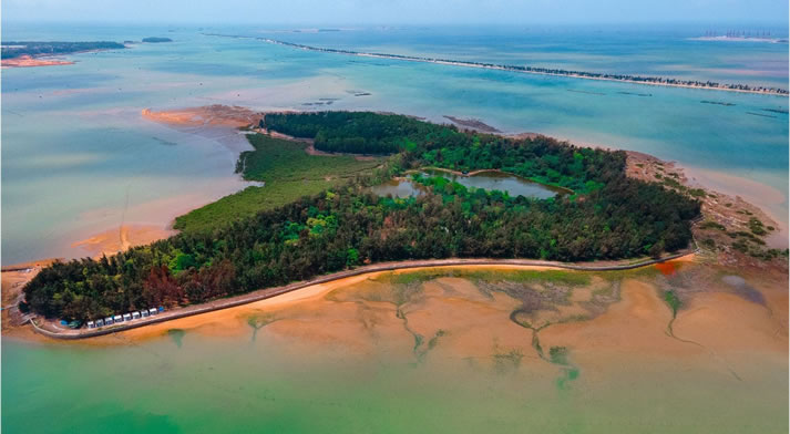 平山島,坐落在欽州城的南面,四面環(huán)水,與市區(qū)一水相隔土地平坦,林豐草茂,臨海的一面又突兀一座山峰,風(fēng)光旖旎,景色秀麗?滴鯉X標(biāo)準(zhǔn)海堤,全長三十多千米, 號(hào)稱廣西第一堤,俗稱“海上長城”。