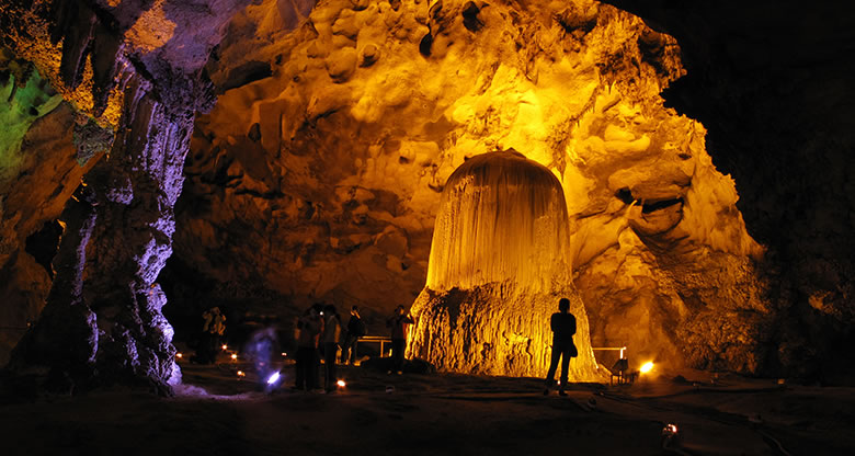 天鐘洞長二千公尺,洞廳高大,廓道迂回。鈣化堆積物發(fā)育良好,形態(tài)逼真生動,且洞內(nèi)道路平坦,可觀性強。洞內(nèi)鐘乳石多酷肖動物,有鱷魚廳,金雞廳、百獸廳和犀牛廳等。