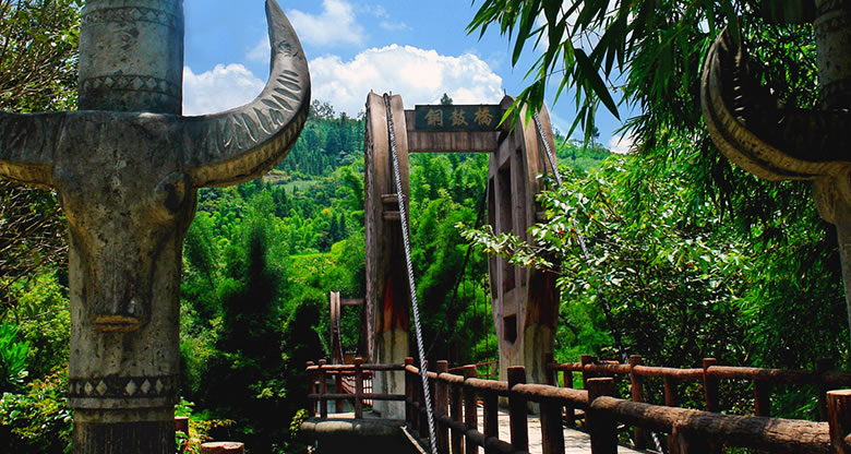 橋長126米,凈跨60米,寬2.4米,高25米,橋身兩端采用瑤山瑤族銅鼓造型,瑤族將銅鼓視為神賜之物,鎮(zhèn)寨之寶,是權力的象征。橋頭設立的圖騰柱代表著瑤族的尊嚴和崇拜,柱身上的浮雕圖案展示了瑤族傳統(tǒng)、獨特而古老的民族文化,具有濃郁的地方民族特色。