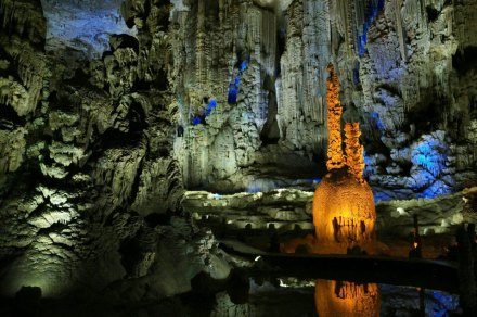 積七萬多平方米,最寬處達(dá)一百七十五米,最高處一百五墕主。洞內(nèi)地勢起伏,石峰叢立,如重巒疊嶂,山間常有云霧繚繞。有金色塔山、成林玉樹,還有螺旋狀的高大石柱“螺旋樹”。