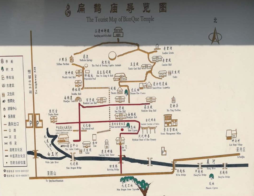 扁鵲廟古建筑群處在群山環(huán)抱之中,廟殿布局嚴(yán)謹(jǐn),木石結(jié)構(gòu),描梁畫棟,奇脊飛檐,紅磚綠瓦?傮w呈長(zhǎng)方形,按天(玉皇)、地(后土)、人(扁鵲)三才布局,F(xiàn)存有回生橋、山門、扁鵲殿、后土總司殿、玉皇殿、三清殿、老君殿、財(cái)神殿百子殿、三霄殿、藥王廟等19座,占地面積15萬平方米,以扁鵲廟為中心形成了龐大的古建筑群,總體布局合理,結(jié)構(gòu)緊湊;是北方典型的道教廟群。其中扁鵲殿、扁鵲墓、透靈碑、回生橋、九龍柏、古代碑廊、三清殿、漢代神獸,為扁鵲廟八大景觀。