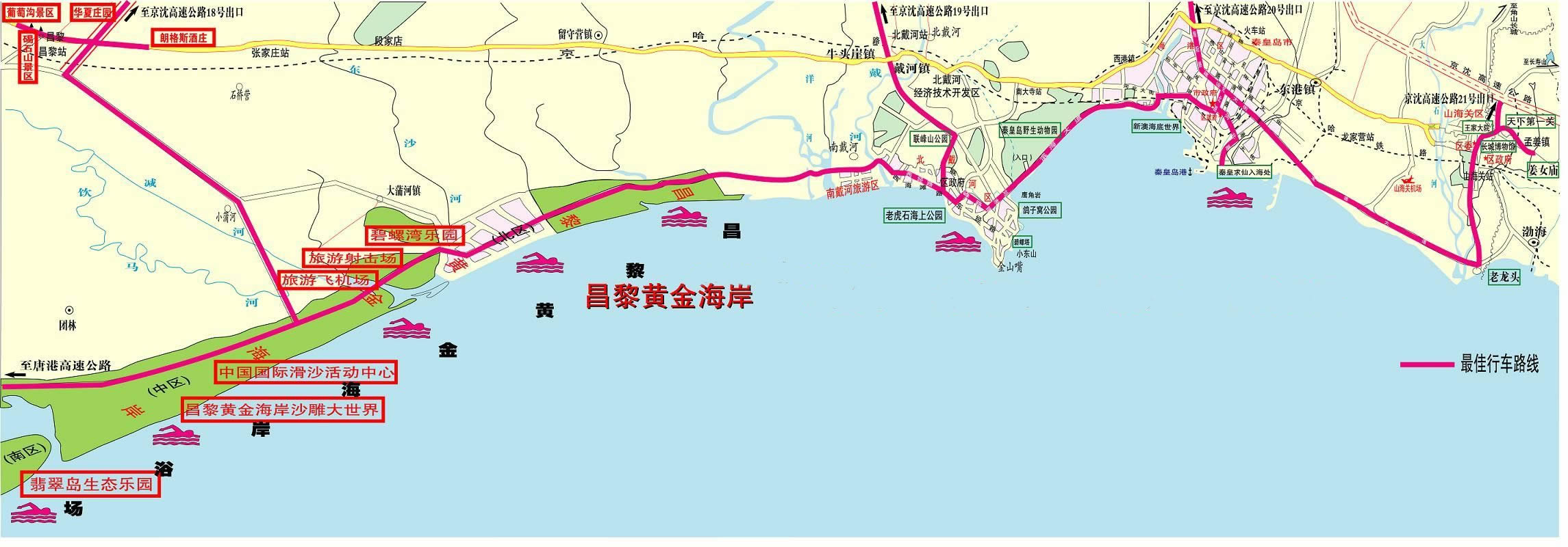 位于河北省昌黎縣東南面的渤海岸邊,海岸線全長52.1公里,具有沙細(xì),灘軟,水清,潮平的特點,是進(jìn)行海水浴、陽光浴、沙浴、森林浴、空氣浴的理想地點。