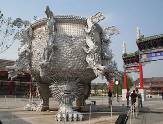 九龍鼎采用杯、羹、匙、盅、盤、碟、碗等青花玲瓏瓷具近4萬件,鼎高和直徑均為6米,最大處直徑10米,通過資深彩燈匠人利用棉線,親手捆扎手工編織而成。各類瓷器都按照設(shè)計圖紙標準施工,制作工藝精巧、制作過程嚴謹。主體為鋼結(jié)構(gòu),整體外光源,龍頭有LED追光變幻和噴霧效果。其創(chuàng)意深邃,規(guī);趾,構(gòu)思巧妙、制作精致、氣勢磅礴,既露王者風范又顯民俗特色。