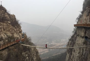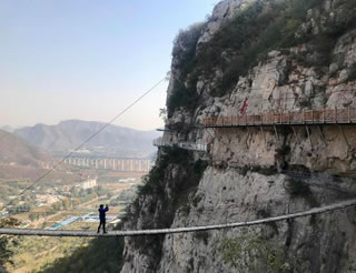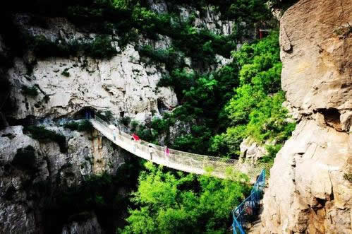 佛爺洞與七星洞有一峽谷相隔,景區(qū)開(kāi)發(fā)者便凌空架起一道35米開(kāi)的鐵索橋,把天塹變?yōu)橥ㄍ臼箖啥聪噙B,人踏鐵索橋一步九顫蕩悠悠,頓生“大渡橋橫鐵索寒”之感。不過(guò),這里的鐵索橋絕對(duì)安全,被人譽(yù)為“冀南一絕有驚無(wú)險(xiǎn)”是游人獵奇探險(xiǎn)鍛煉意志和膽量的絕佳場(chǎng)所。