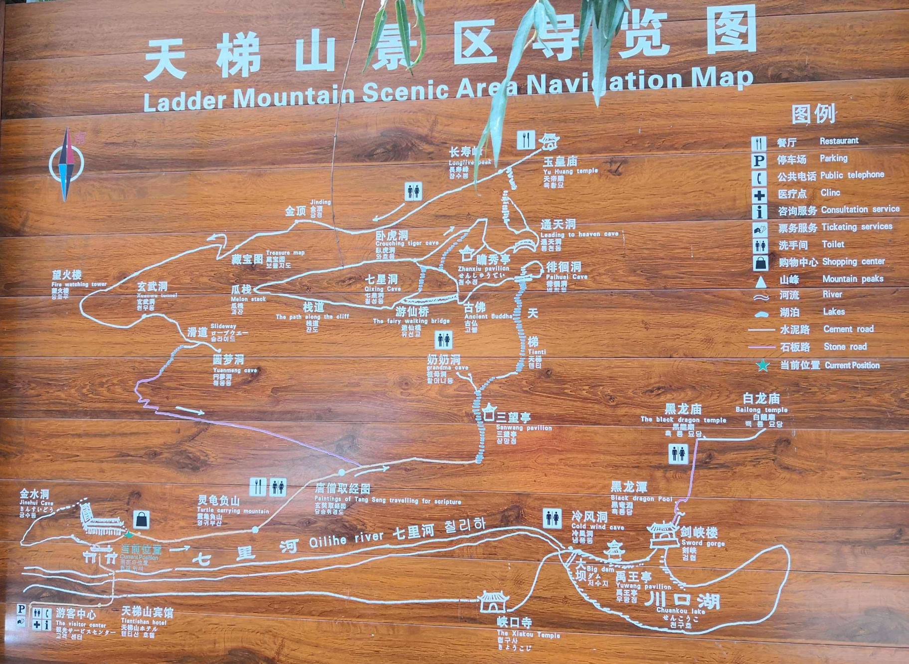 天梯山主峰長(zhǎng)壽峰,俗稱(chēng)金頂,垂直拔高550米,是觀日出的好地方。金頂上金石、玉石、雨花石儲(chǔ)量豐富,美麗的民間傳說(shuō)為其增添了神奇的色彩。金頂一側(cè)裸露的巨石上鑲嵌一張藏寶圖,石紋盤(pán)結(jié)宛若天書(shū),意象鮮明引人注目,猛一看雜亂無(wú)章,細(xì)觀瞧神工杰作,口碑流傳:“南坡至北坡,金子一大鍋,誰(shuí)能解開(kāi)謎,便是得寶者!”游客到此無(wú)不躍躍欲試,試圖解開(kāi)“藏寶圖”之謎發(fā)一筆大財(cái)。