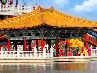八闋經(jīng)典宋詞和一幅《清明上河圖》串聯(lián)的畫(huà)面,將精心選擇的北宋印象包含進(jìn)去,以喚起一個(gè)民族對(duì)興衰的思考和渴望崛起的激情!洞笏巍|京夢(mèng)華》實(shí)景演出選擇在清明上河園皇家園林區(qū)的景龍湖上,充分利用了亭臺(tái)樓榭、水榭橋廊,構(gòu)成了一個(gè)完整的古典實(shí)景劇場(chǎng)。