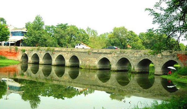 老城九孔橋:自明弘治十年(公元1497年)到建國后的1950年10月老城鎮(zhèn)一直是沈丘縣治所所在地,城南緊靠東西流向的泉河,當(dāng)時(shí)河寬水深,各種貨物可上通漯河,下達(dá)臨泉、潁州(現(xiàn)阜陽市),經(jīng)潁上至正陽入淮河,當(dāng)時(shí)是一條繁盛的“黃金水道”。但城南無橋,南北兩岸大量人員來往,貨物運(yùn)送,全靠船渡,因水大、人多、貨物超載或遇急風(fēng)惡浪,每年都有事故發(fā)生。1973年、1981年沈丘縣人民政府兩次撥款4.1萬元,維修九孔橋。因九孔橋是周口至臨泉的主要交通干道,經(jīng)常有幾十噸的大貨車在橋上行駛,常年承受著交通重載,所以到1998年南橋頭西側(cè)倒塌了十幾米,致使車輛無法行走。1999年,沈丘縣人大代表、老城東升布鞋廠廠長郭傳興個(gè)人出資5萬元,南關(guān)行政村支部書記張連營負(fù)責(zé)施工補(bǔ)修,把橋加長4米,全橋長達(dá)99米,19天后竣工,F(xiàn)橋體基本完好,車輛行人稱便。
