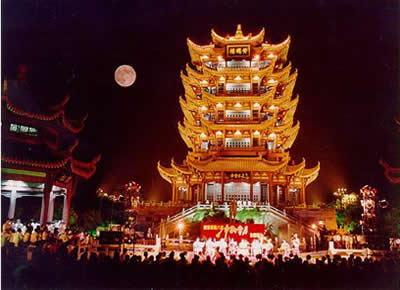 號(hào)稱江南三大名樓之一的黃鶴樓,原址在湖北武昌蛇山黃鶴磯頭,原為辛氏開(kāi)設(shè)的酒店,一道士為了感謝她千杯之恩,臨行前在壁上畫了一只鶴,告之它能下來(lái)起舞助興。從此賓客盈門,生意興隆。過(guò)了十年,道士復(fù)來(lái),取笛