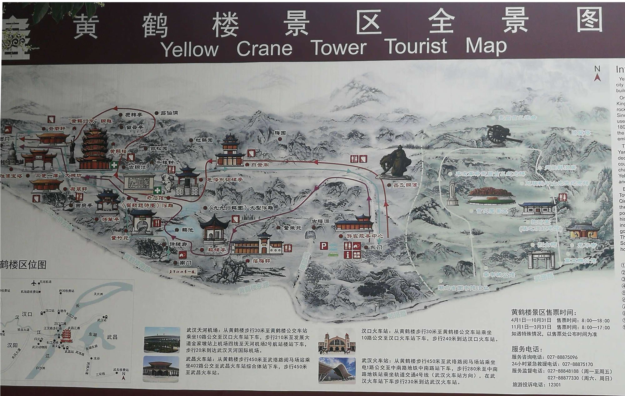 塔、碑廊、山門等建筑。整個(gè)建筑具有獨(dú)特的民族風(fēng)格。黃鶴樓內(nèi)部,層層風(fēng)格不相同。底層為一高大寬敞的大廳,其正中藻井高達(dá)10多米,正面壁上為一幅巨大的“白云黃鶴”陶瓷壁畫,兩旁立柱上懸掛著長(zhǎng)達(dá)7米的楹聯(lián):爽氣西來(lái),云霧掃開(kāi)天地撼;大江東去,波濤洗凈古今愁。二樓大廳正面墻上,有用大理石鐫刻的唐代閻伯瑾撰寫的《黃鶴樓記》,它記述了黃鶴樓興廢沿革和名人軼事;樓記兩側(cè)為兩幅壁畫,一幅是“孫權(quán)筑城”,形象地說(shuō)明黃鶴樓和武昌城相繼誕生的歷史;另一幅是“周瑜設(shè)宴”,反映三國(guó)名人去黃鶴樓的活動(dòng)。三樓大廳的壁畫為唐宋名人的“繡像畫”,如崔顥、李白、白居易等,也摘錄了他們吟詠黃鶴樓的名句。四樓大廳用屏風(fēng)分割幾個(gè)小廳,內(nèi)置當(dāng)代名人字畫,供游客欣賞、選購(gòu)。頂層大廳有《長(zhǎng)江萬(wàn)里圖》等長(zhǎng)卷、壁畫!