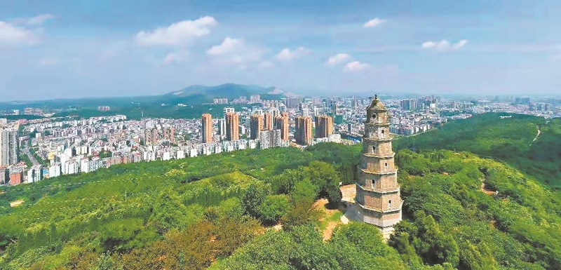 東寶塔是荊門(mén)今存的唯一一處具有千年歷史的地面文物,建于隋開(kāi)皇十三年(公元593年)。寶塔通高33.3米,底部周長(zhǎng)30.6米,七層四面八角,隔面設(shè)窗,攢尖式塔頂。塔基座周長(zhǎng)31.2米,高0.76米。基座之上都有石須彌座,須彌座八角各雕一尊托塔金剛。底層門(mén)楣有石刻“長(zhǎng)林頭角”四字,自底層有螺旋狀青石階梯上塔頂(海拔260米)。