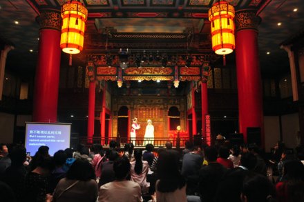 民俗茶社:民俗茶社是一座全木結(jié)構(gòu)仿古茶社,精湛地展現(xiàn)了非物質(zhì)文化遺產(chǎn)項(xiàng)目——香山幫傳統(tǒng)建筑營造技藝。茶社完全按照老式茶社布局修建,天井蘇式彩畫艷麗奪目,戲臺金碧輝煌,木雕隔斷精致巧妙,池心敞亮寬闊,包廂整肅典雅,是觀眾欣賞江蘇省表演類非遺項(xiàng)目和品味江蘇省飲食技藝類非遺項(xiàng)目的最佳場所,是“動態(tài)”展示非物質(zhì)文化遺產(chǎn)的文化空間。在這里,將定期上演江蘇特有的曲藝、傳統(tǒng)戲劇折子戲和民間音樂等項(xiàng)目,如蘇州評彈、南京白局、昆曲折子戲、江南絲竹等等;并采用傳統(tǒng)茶館中“葷茶館”的形式;把南京雨花茶、蘇州洞庭碧螺春、連云港云霧茶等進(jìn)入非遺名錄的茶飲和其他飲食項(xiàng)目同時納入其中。演出時間為每天下午14:30—15:30,具體演出項(xiàng)目請關(guān)注屏幕導(dǎo)覽和南博網(wǎng)站。